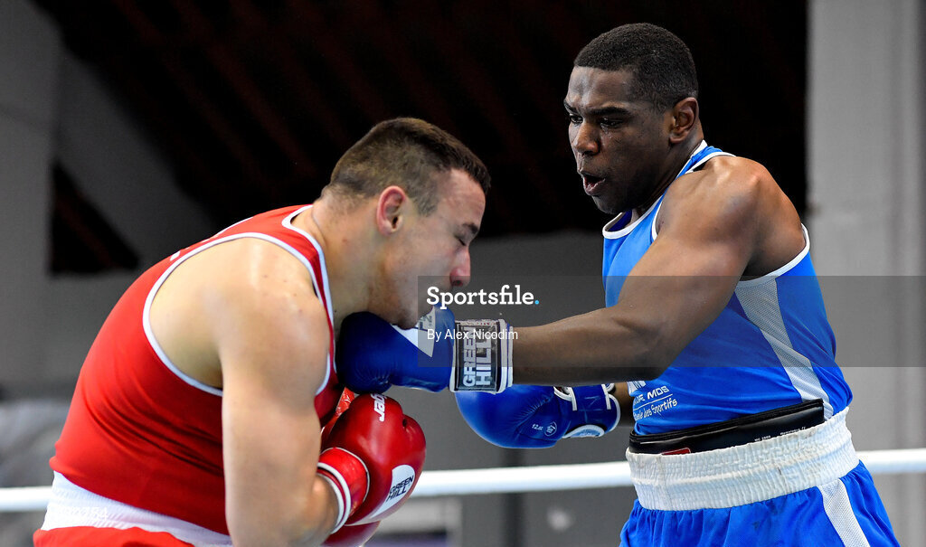26 February 2021; Wilfried Florentin of France, right, and Radoslav Pantaleev of Bulgaria during their men's heavyweight 91kg semi-final bout at the AIBA Strandja Memorial Boxing Tournament in Sofia, Bulgaria. Photo by Alex Nicodim/Sportsfile