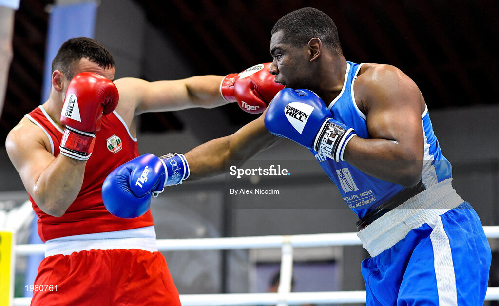 26 February 2021; Wilfried Florentin of France, right, and Radoslav Pantaleev of Bulgaria during their men's heavyweight 91kg semi-final bout at the AIBA Strandja Memorial Boxing Tournament in Sofia, Bulgaria. Photo by Alex Nicodim/Sportsfile