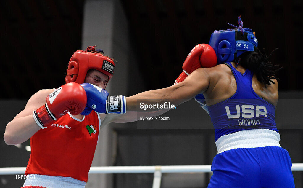 26 February 2021; Aoife O'Rourke of Ireland, left, and Naomi Graham of United States during their women's middleweight 75kg semi-final bout at the AIBA Strandja Memorial Boxing Tournament in Sofia, Bulgaria. Photo by Alex Nicodim/Sportsfile