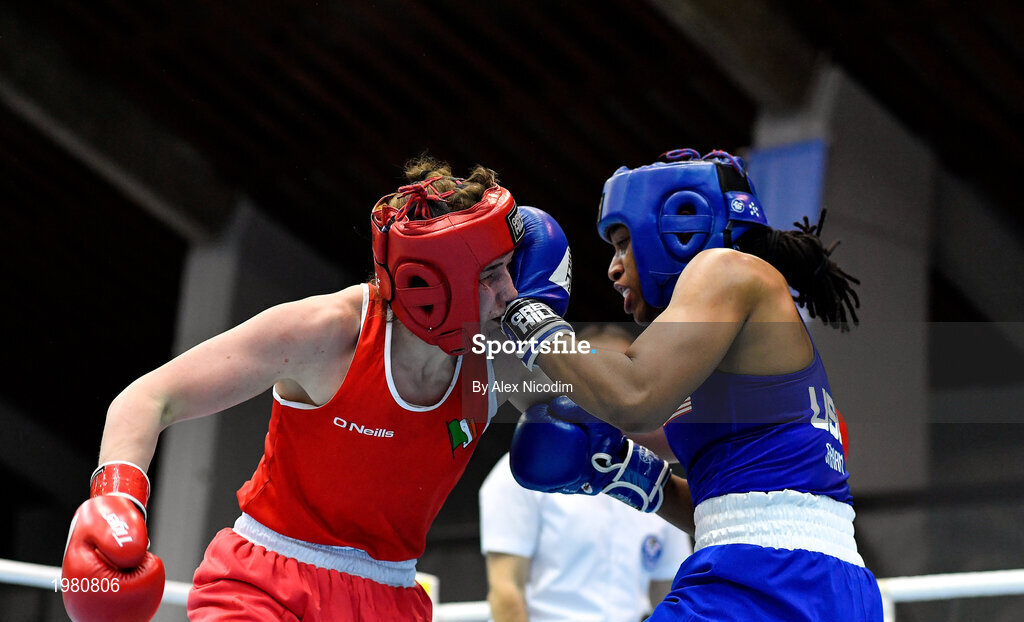 26 February 2021; Aoife O'Rourke of Ireland, left, and Naomi Graham of United States during their women's middleweight 75kg semi-final bout at the AIBA Strandja Memorial Boxing Tournament in Sofia, Bulgaria. Photo by Alex Nicodim/Sportsfile