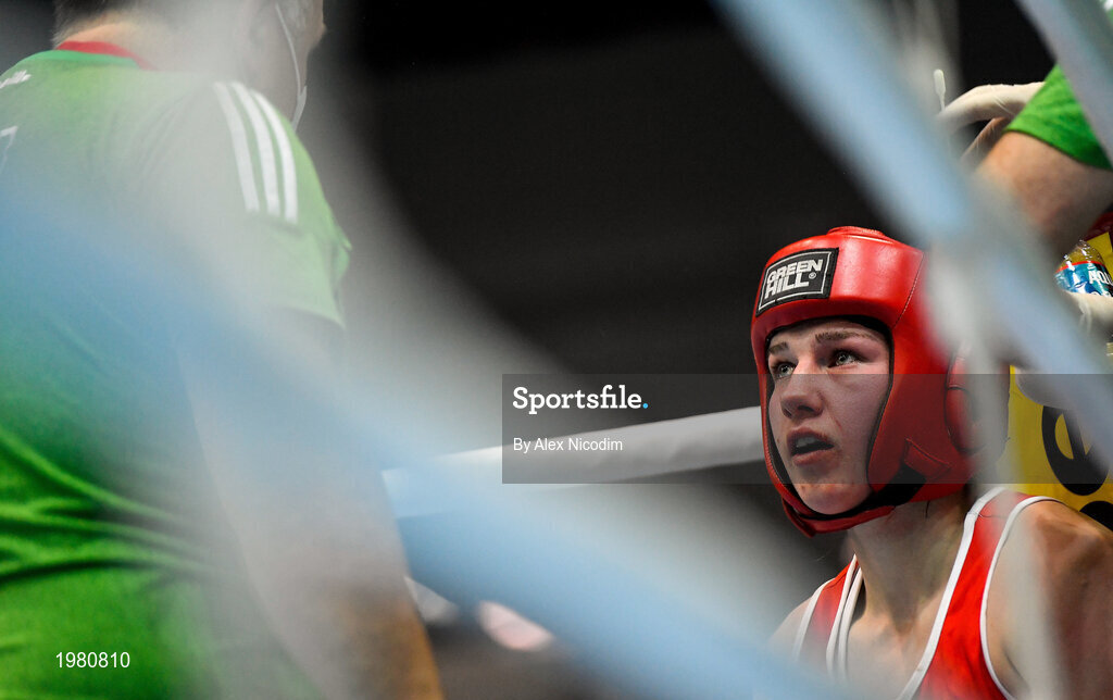 26 February 2021; Aoife O'Rourke of Ireland with coaches Zauri Antia, left, and Dmitry Dmitruk during her women's middleweight 75kg semi-final bout against Naomi Graham of United States at the AIBA Strandja Memorial Boxing Tournament in Sofia, Bulgaria. Photo by Alex Nicodim/Sportsfile
