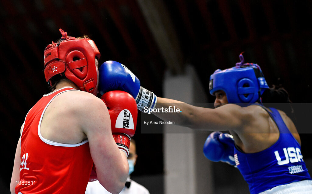 26 February 2021; Aoife O'Rourke of Ireland, left, and Naomi Graham of United States during their women's middleweight 75kg semi-final bout at the AIBA Strandja Memorial Boxing Tournament in Sofia, Bulgaria. Photo by Alex Nicodim/Sportsfile