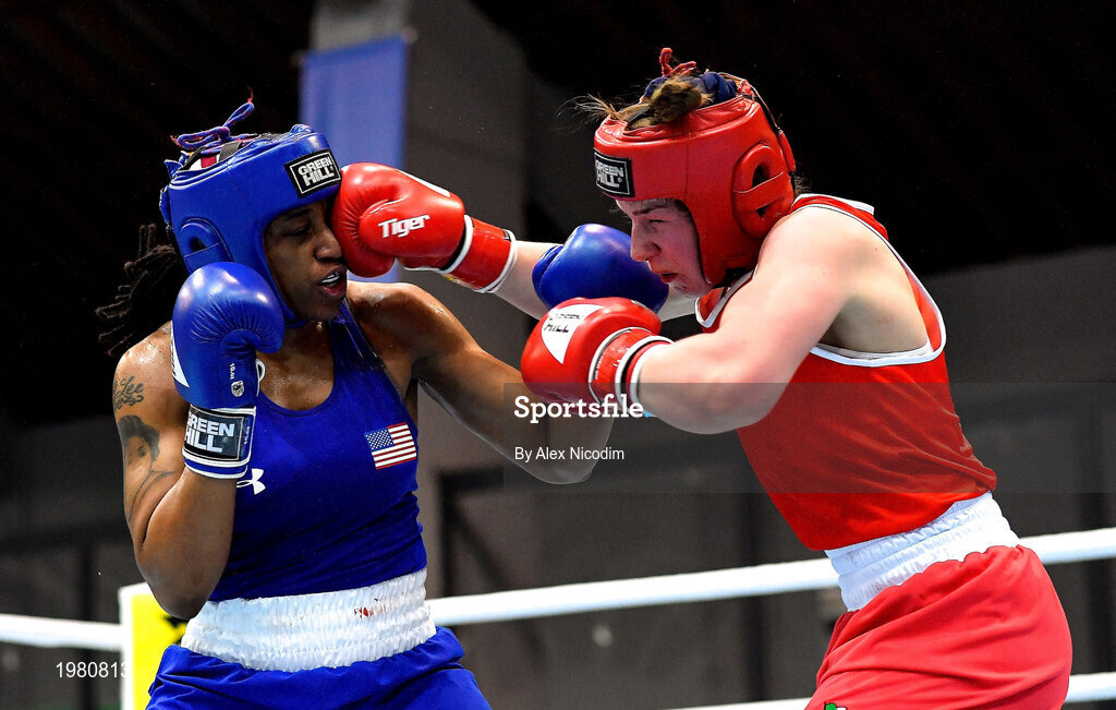 26 February 2021; Aoife O'Rourke of Ireland, right, and Naomi Graham of United States during their women's middleweight 75kg semi-final bout at the AIBA Strandja Memorial Boxing Tournament in Sofia, Bulgaria. Photo by Alex Nicodim/Sportsfile