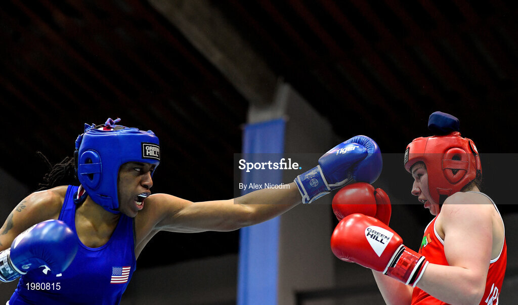 26 February 2021; Aoife O'Rourke of Ireland, right, and Naomi Graham of United States during their women's middleweight 75kg semi-final bout at the AIBA Strandja Memorial Boxing Tournament in Sofia, Bulgaria. Photo by Alex Nicodim/Sportsfile