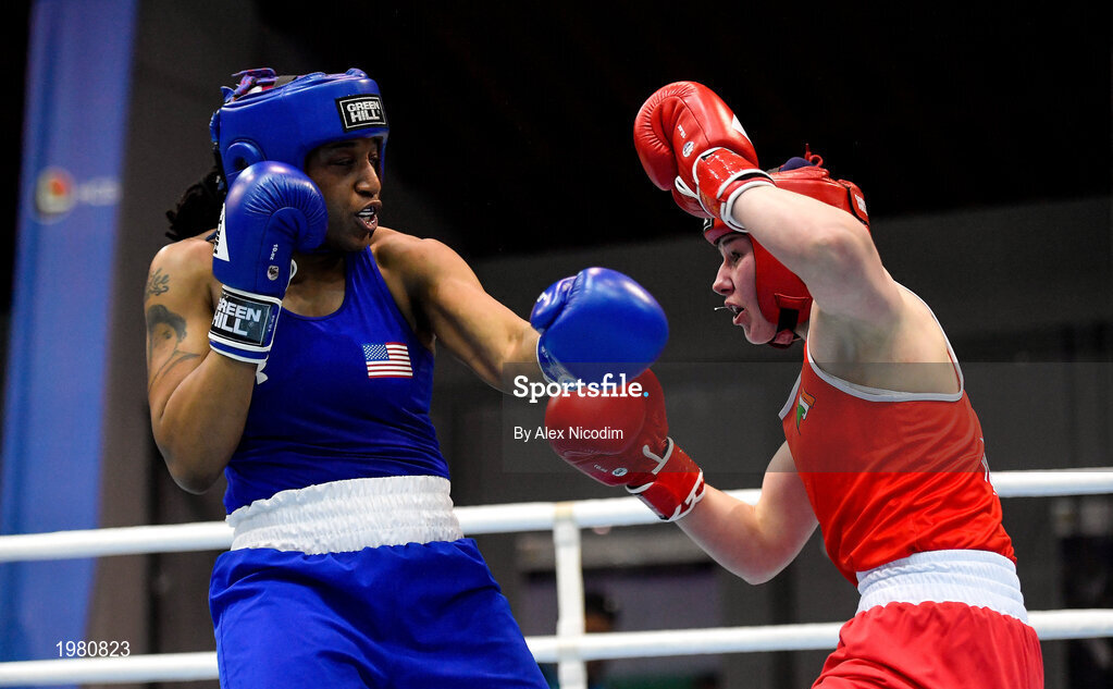 26 February 2021; Aoife O'Rourke of Ireland, right, and Naomi Graham of United States during their women's middleweight 75kg semi-final bout at the AIBA Strandja Memorial Boxing Tournament in Sofia, Bulgaria. Photo by Alex Nicodim/Sportsfile