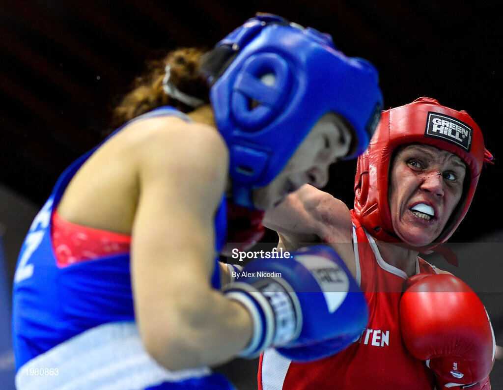 26 February 2021; Mira Potkonen of Finland, right, and Karina Ibragimova of Kazakhstan during their women's lightweight 60kg semi-final bout at the AIBA Strandja Memorial Boxing Tournament in Sofia, Bulgaria. Photo by Alex Nicodim/Sportsfile