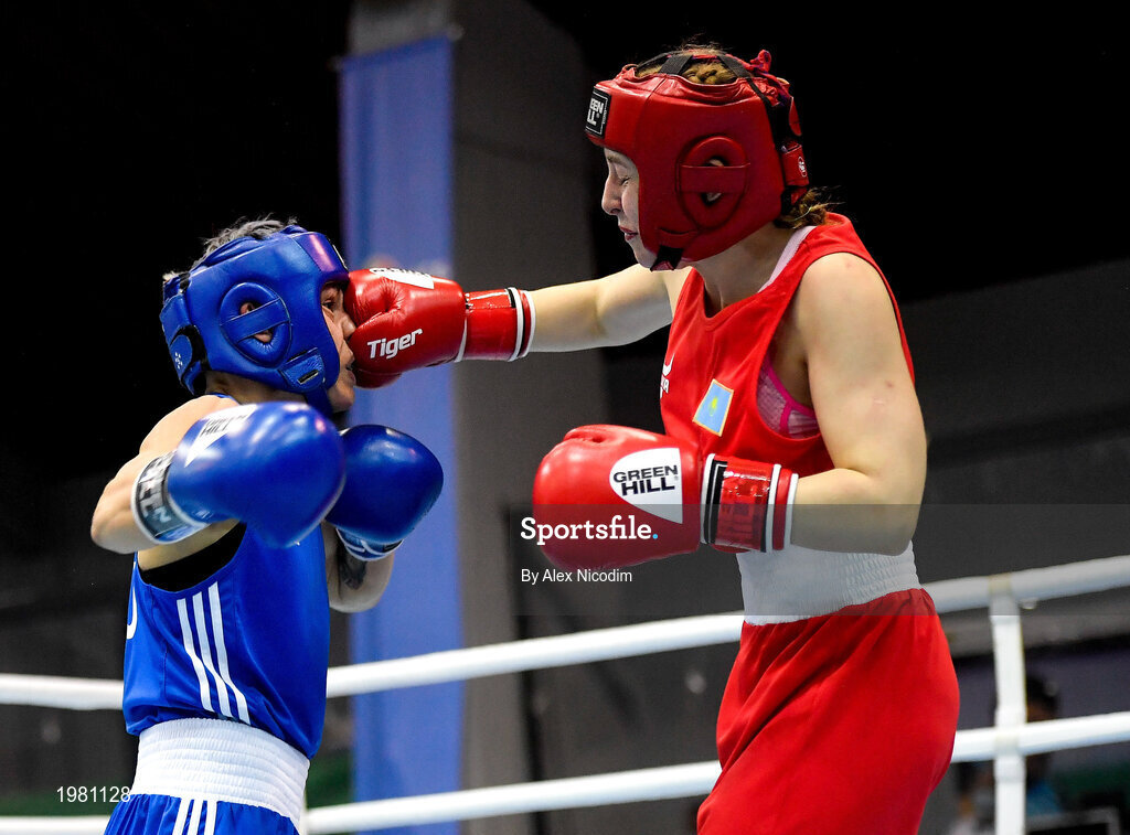 26 February 2021; Angelina Lukas of Kazakhstan, right, and Lacramioara Perijoc of Romania during their women's flyweight 51kg semi-final bout at the AIBA Strandja Memorial Boxing Tournament in Sofia, Bulgaria. Photo by Alex Nicodim/Sportsfile