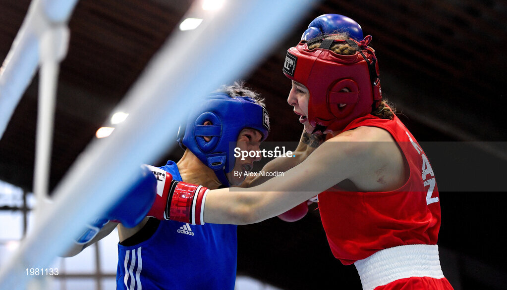 26 February 2021; Angelina Lukas of Kazakhstan, right, and Lacramioara Perijoc of Romania during their women's flyweight 51kg semi-final bout at the AIBA Strandja Memorial Boxing Tournament in Sofia, Bulgaria. Photo by Alex Nicodim/Sportsfile