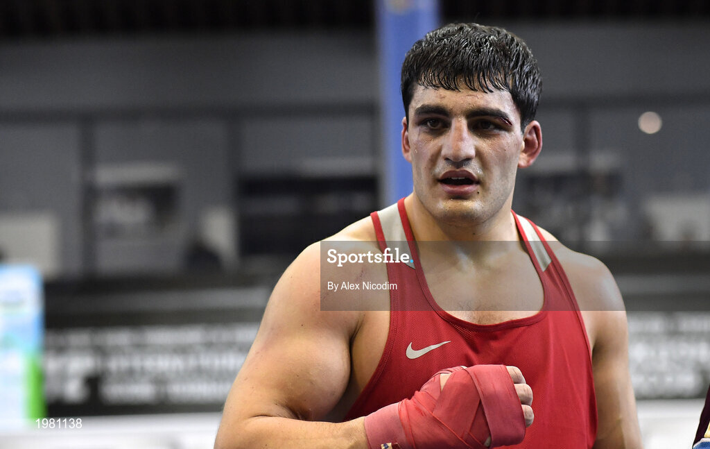 26 February 2021; Narek Manasyan of Armenia celebrates his victory over Artyom Yordanyan of Georgia following their Men's Heavyweight 91kg semi-final bout at the AIBA Strandja Memorial Boxing Tournament in Sofia, Bulgaria. Photo by Alex Nicodim/Sportsfile