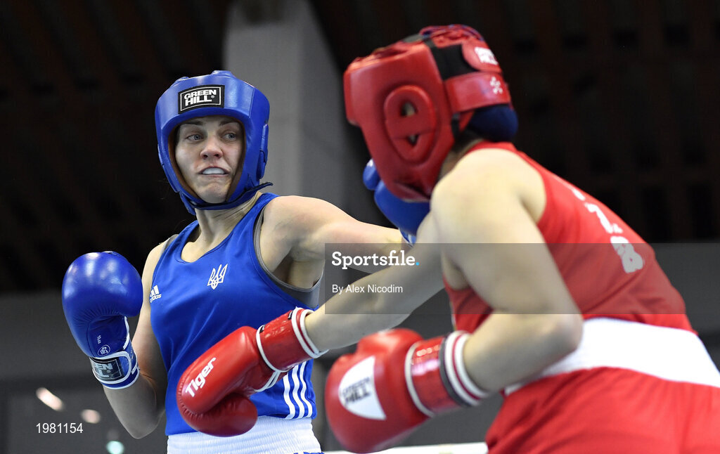 26 February 2021; Navbakhor Khamidova of Uzbekistan, left, and Anna Lysenko of Ukriane during their Women's Welterweight 69kg semi-final bout at the AIBA Strandja Memorial Boxing Tournament in Sofia, Bulgaria. Photo by Alex Nicodim/Sportsfile