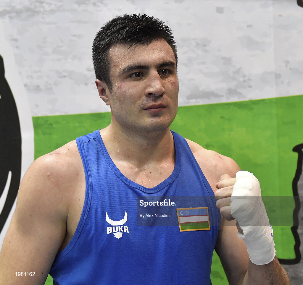26 February 2021; Bokhodir Jalolov of Uzbekistan following his victory in the Men's Super Heavyweight +91kg semi-final bout against Gurgen Hovhannisyan of Armenia at the AIBA Strandja Memorial Boxing Tournament in Sofia, Bulgaria. Photo by Alex Nicodim/Sportsfile