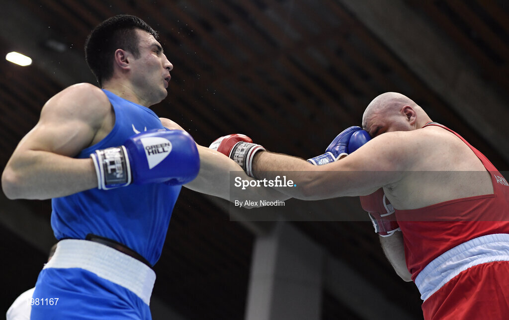 26 February 2021; Bokhodir Jalolov of Uzbekistan, left, and Gurgen Hovhannisyan of Armenia during their Men's Super Heavyweight +91kg semi-final bout at the AIBA Strandja Memorial Boxing Tournament in Sofia, Bulgaria. Photo by Alex Nicodim/Sportsfile
