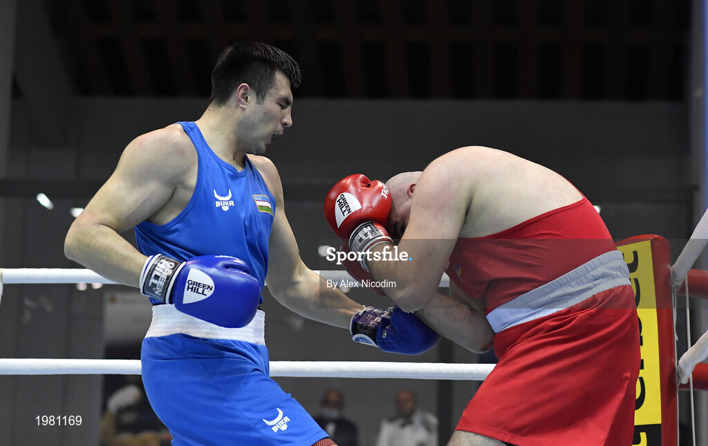 26 February 2021; Bokhodir Jalolov of Uzbekistan, left, and Gurgen Hovhannisyan of Armenia during their Men's Super Heavyweight +91kg semi-final bout at the AIBA Strandja Memorial Boxing Tournament in Sofia, Bulgaria. Photo by Alex Nicodim/Sportsfile