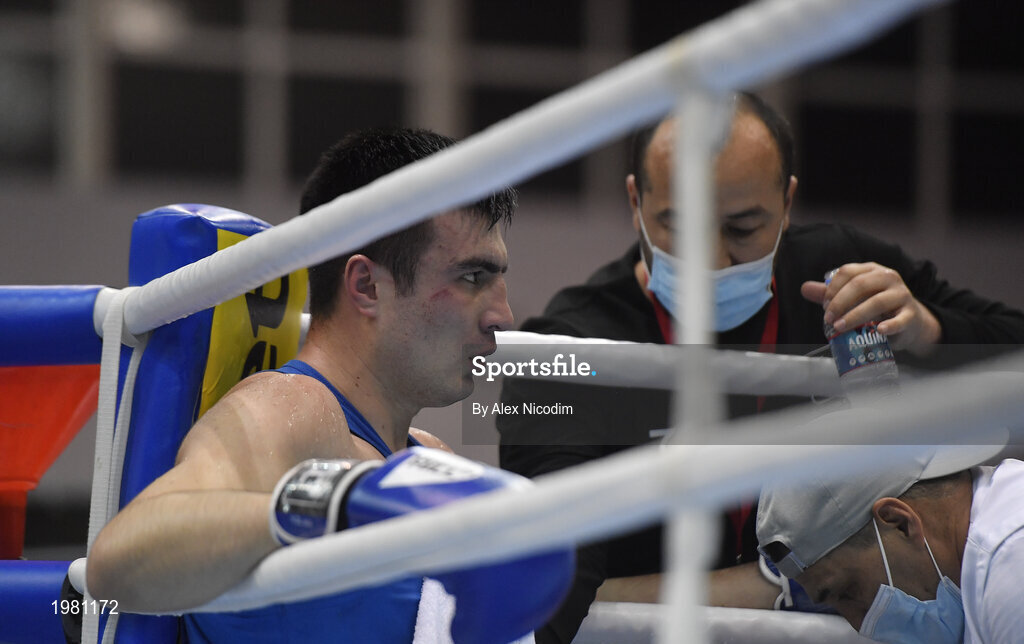 26 February 2021; Bokhodir Jalolov of Uzbekistan is treated during the Men's Super Heavyweight +91kg semi-final bout at the AIBA Strandja Memorial Boxing Tournament in Sofia, Bulgaria. Photo by Alex Nicodim/Sportsfile