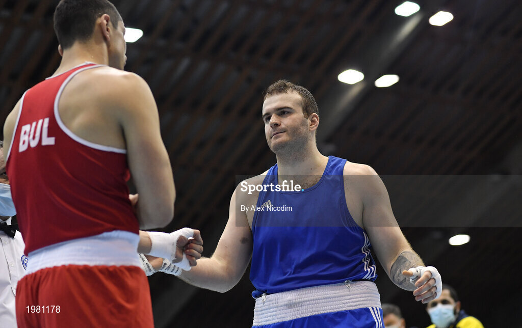 26 February 2021; Tsotne Rogava of Ukraine after defeating Petar Belberov of Bulgaria, after getting injured after 10 seconds of the fight, following their men's Super heavyweight +91kg semi-final bout at the AIBA Strandja Memorial Boxing Tournament in Sofia, Bulgaria. Photo by Alex Nicodim/Sportsfile