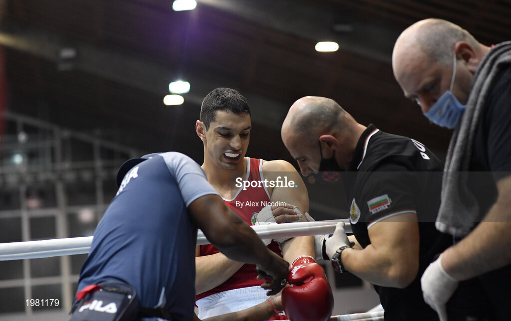 26 February 2021; Petar Belberov of Bulgaria receives treatment from his corner after picking up an injury after 10 seconds of the men's Super heavyweight +91kg semi-final bout at the AIBA Strandja Memorial Boxing Tournament in Sofia, Bulgaria. Photo by Alex Nicodim/Sportsfile