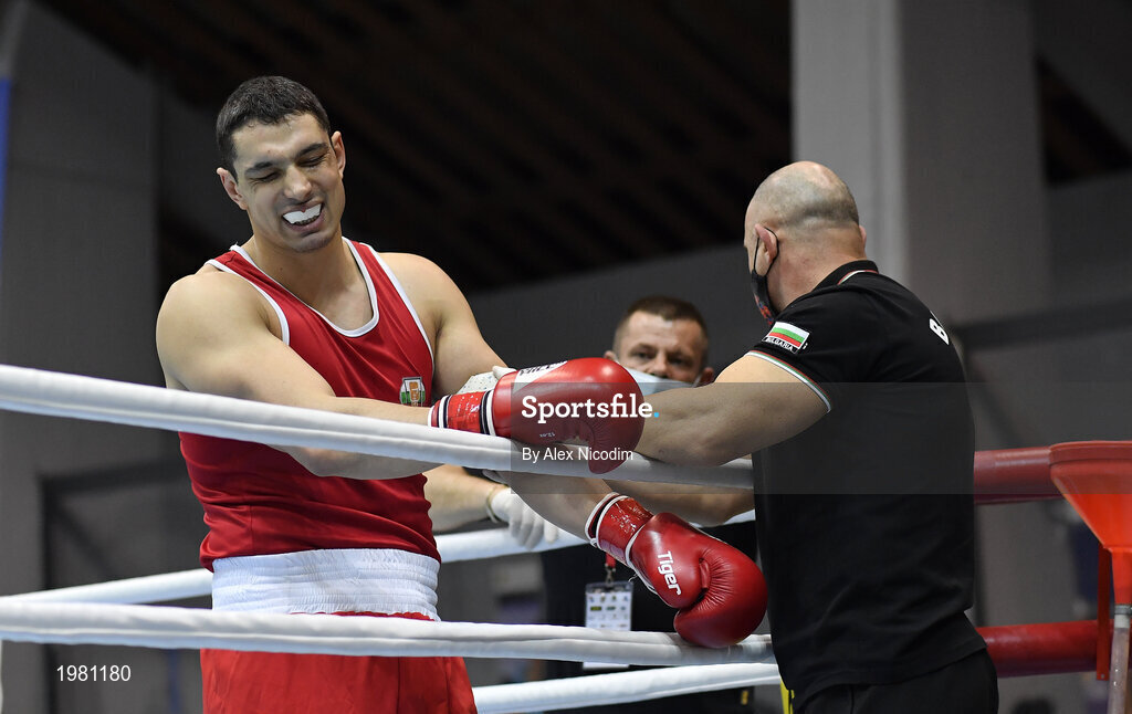 26 February 2021; Petar Belberov of Bulgaria receives treatment from his corner after picking up an injury after 10 seconds of the men's Super heavyweight +91kg semi-final bout at the AIBA Strandja Memorial Boxing Tournament in Sofia, Bulgaria. Photo by Alex Nicodim/Sportsfile