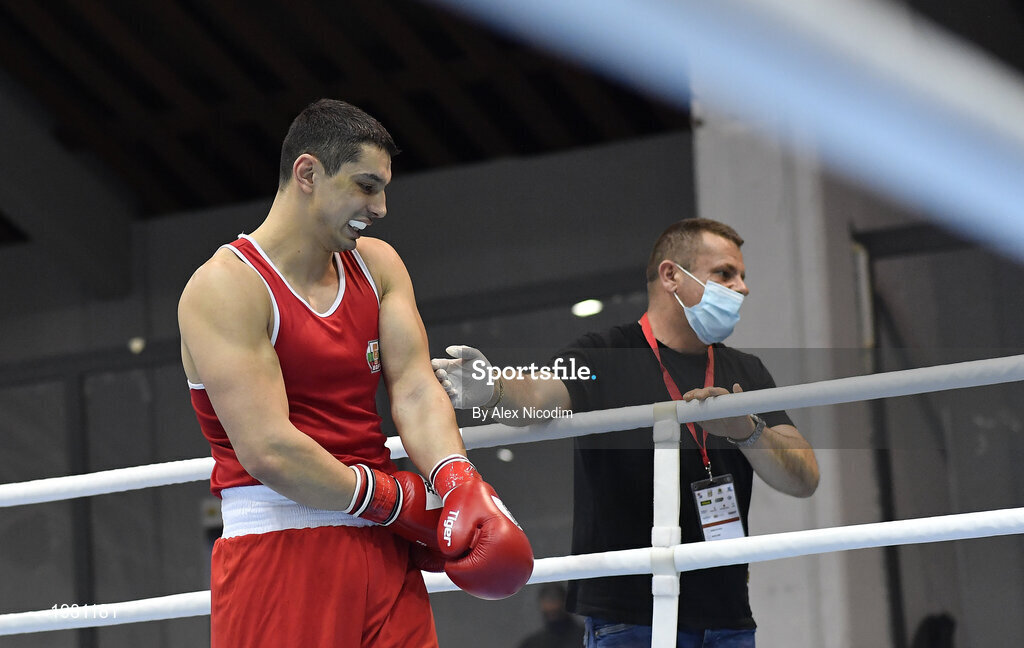 26 February 2021; Petar Belberov of Bulgaria returns to his corner after picking up an injury after 10 seconds of the men's Super heavyweight +91kg semi-final bout at the AIBA Strandja Memorial Boxing Tournament in Sofia, Bulgaria. Photo by Alex Nicodim/Sportsfile