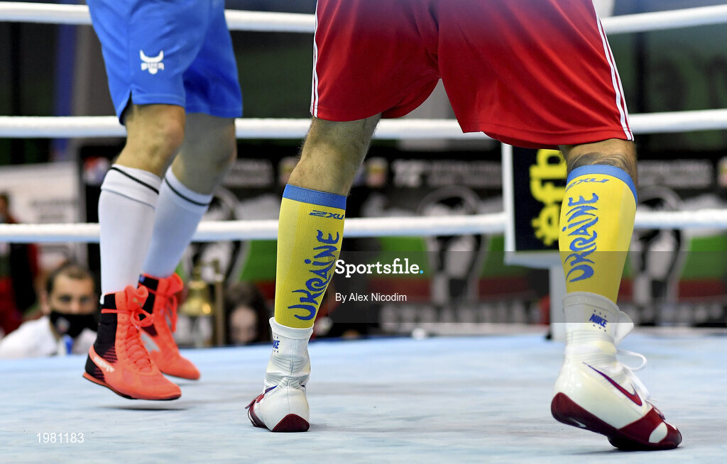 26 February 2021; A detailed view of the boots of Dilshodbek Ruzmetov of Uzbekistan, left, and Maxym Kots of Ukraine during their men's light heavyweight 81kg semi-final bout at the AIBA Strandja Memorial Boxing Tournament in Sofia, Bulgaria. Photo by Alex Nicodim/Sportsfile