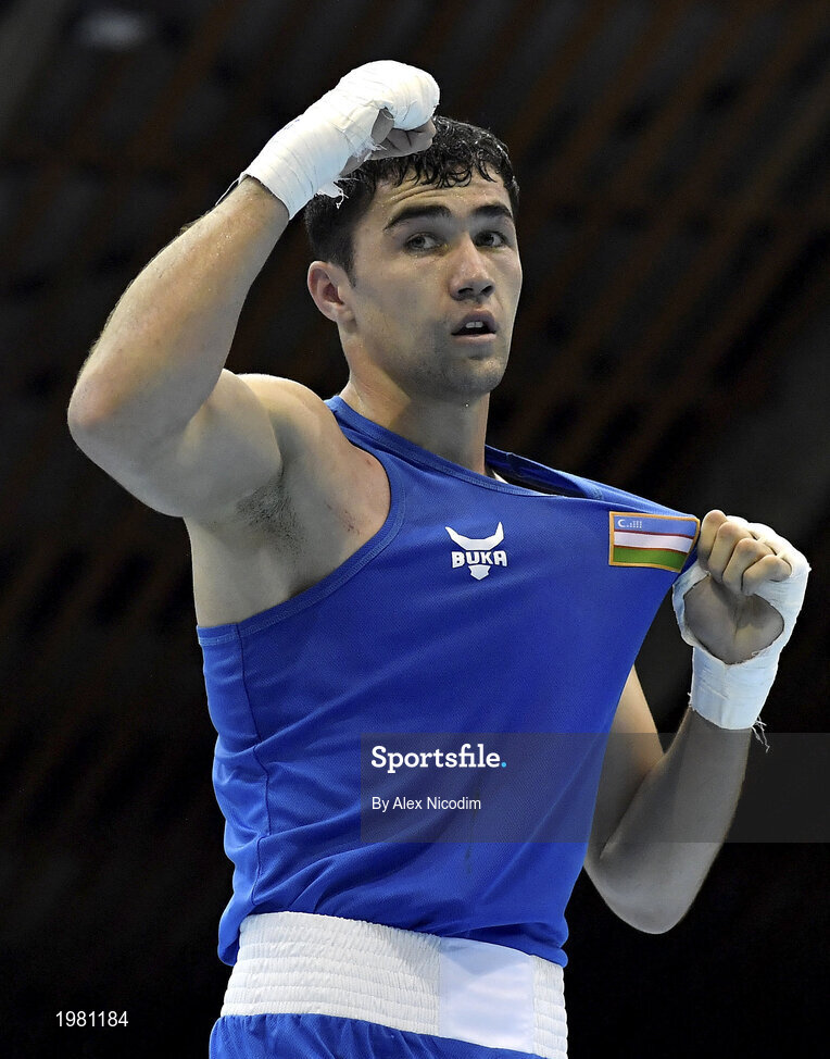 26 February 2021; Dilshodbek Ruzmetov of Uzbekistan following his victory over Maxym Kots of Ukraine following their men's light heavyweight 81kg semi-final bout at the AIBA Strandja Memorial Boxing Tournament in Sofia, Bulgaria. Photo by Alex Nicodim/Sportsfile