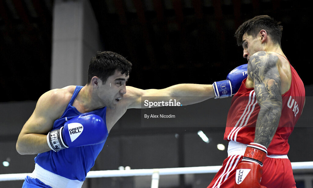 26 February 2021; Dilshodbek Ruzmetov of Uzbekistan, left, and Maxym Kots of Ukraine during their men's light heavyweight 81kg semi-final bout at the AIBA Strandja Memorial Boxing Tournament in Sofia, Bulgaria. Photo by Alex Nicodim/Sportsfile