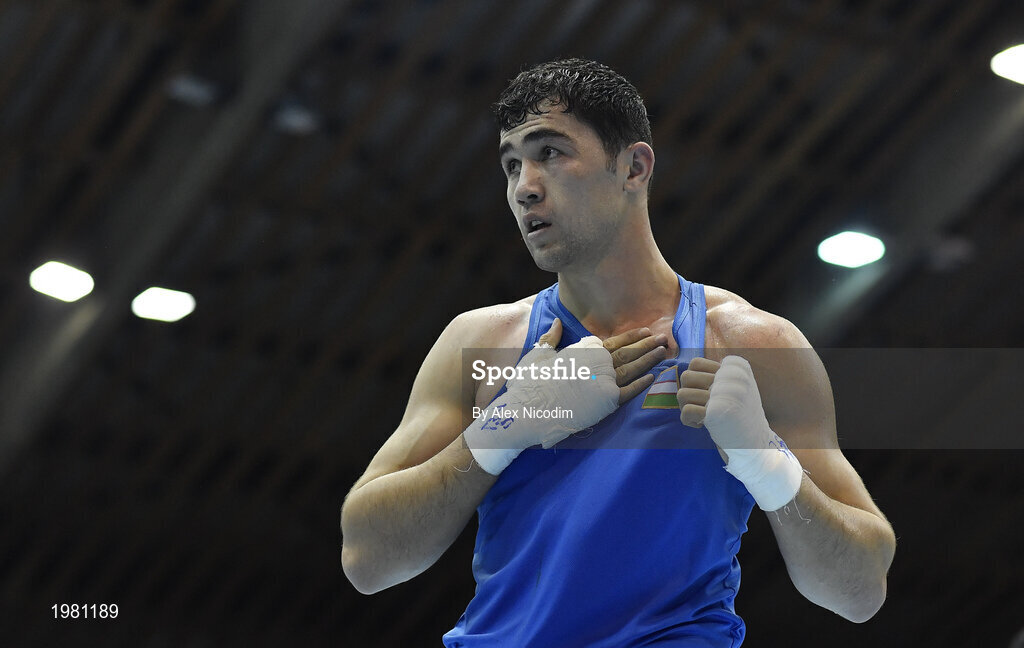 26 February 2021; Dilshodbek Ruzmetov of Uzbekistan following his victory over Maxym Kots of Ukraine following their men's light heavyweight 81kg semi-final bout at the AIBA Strandja Memorial Boxing Tournament in Sofia, Bulgaria. Photo by Alex Nicodim/Sportsfile