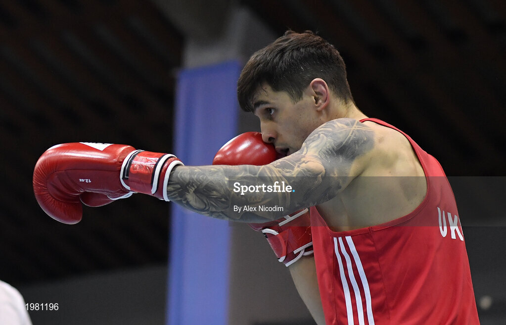 26 February 2021; Maxym Kots of Ukraine during his men's light heavyweight 81kg semi-final bout against Dilshodbek Ruzmetov of Uzbekistan at the AIBA Strandja Memorial Boxing Tournament in Sofia, Bulgaria. Photo by Alex Nicodim/Sportsfile