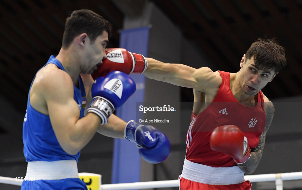 26 February 2021; Maxym Kots of Ukraine, right, and Dilshodbek Ruzmetov of Uzbekistan during their men's light heavyweight 81kg semi-final bout at the AIBA Strandja Memorial Boxing Tournament in Sofia, Bulgaria. Photo by Alex Nicodim/Sportsfile