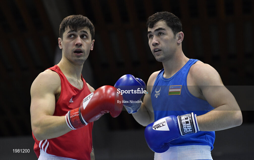 26 February 2021; Maxym Kots of Ukraine, right, and Dilshodbek Ruzmetov of Uzbekistan during their men's light heavyweight 81kg semi-final bout at the AIBA Strandja Memorial Boxing Tournament in Sofia, Bulgaria. Photo by Alex Nicodim/Sportsfile