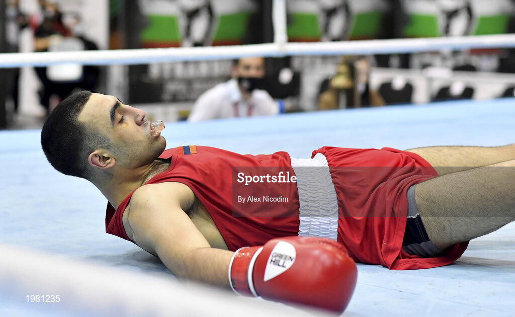 26 February 2021; Gor Nersesyan of Armenia is knocked down by Ruslan Koleshnikov of Russia during their men's light heavyweight 81kg semi-final bout at the AIBA Strandja Memorial Boxing Tournament in Sofia, Bulgaria. Photo by Alex Nicodim/Sportsfile