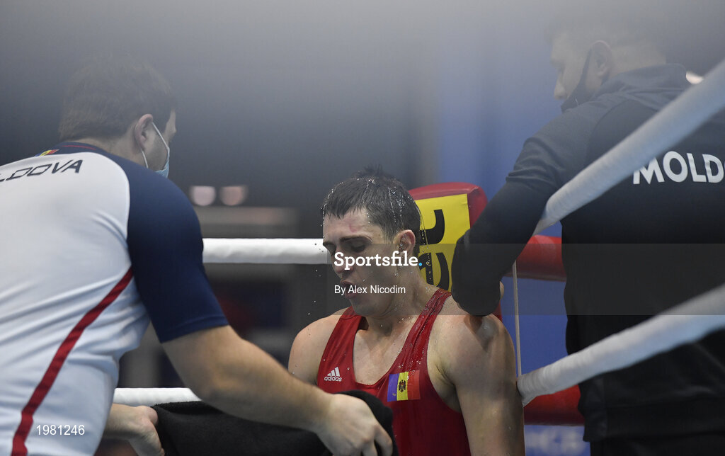26 February 2021; Dmitri Galagot of Moldova during his men's welterweight 69kg semi-final bout against Yevhenii Barabanov of Ukraine at the AIBA Strandja Memorial Boxing Tournament in Sofia, Bulgaria. Photo by Alex Nicodim/Sportsfile