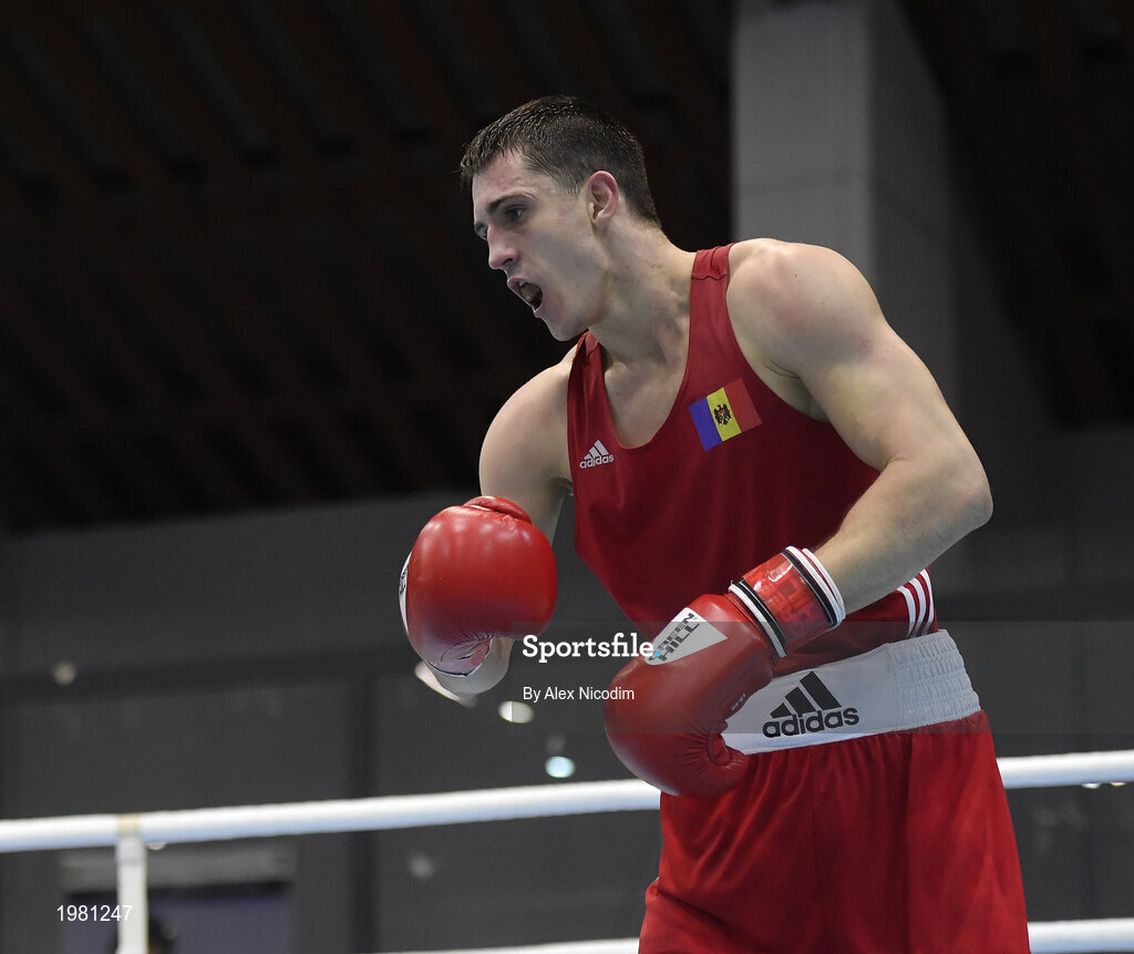 26 February 2021; Dmitri Galagot of Moldova during his men's welterweight 69kg semi-final bout against Yevhenii Barabanov of Ukraine at the AIBA Strandja Memorial Boxing Tournament in Sofia, Bulgaria. Photo by Alex Nicodim/Sportsfile