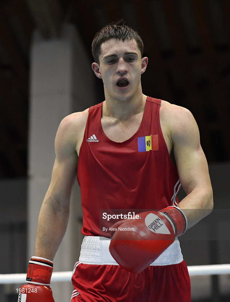 26 February 2021; Dmitri Galagot of Moldova during his men's welterweight 69kg semi-final bout against Yevhenii Barabanov of Ukraine at the AIBA Strandja Memorial Boxing Tournament in Sofia, Bulgaria. Photo by Alex Nicodim/Sportsfile