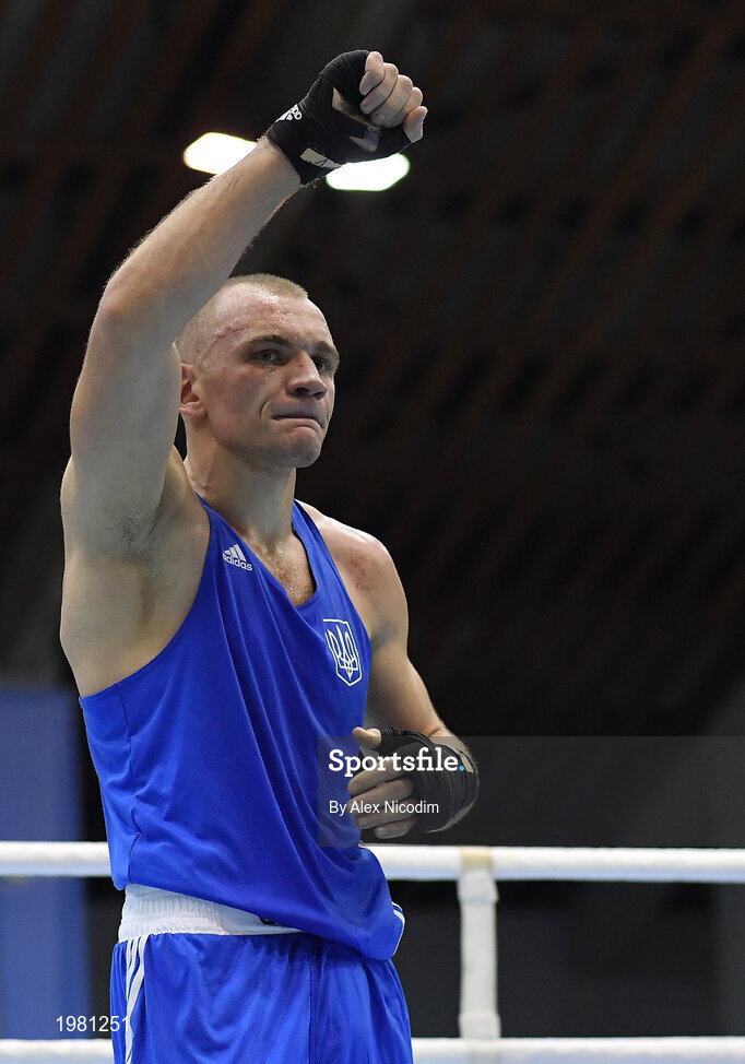 26 February 2021; Yevhenii Barabanov of Ukraine following his victory over Dmitri Galagot of Moldova after their men's welterweight 69kg semi-final bout at the AIBA Strandja Memorial Boxing Tournament in Sofia, Bulgaria. Photo by Alex Nicodim/Sportsfile
