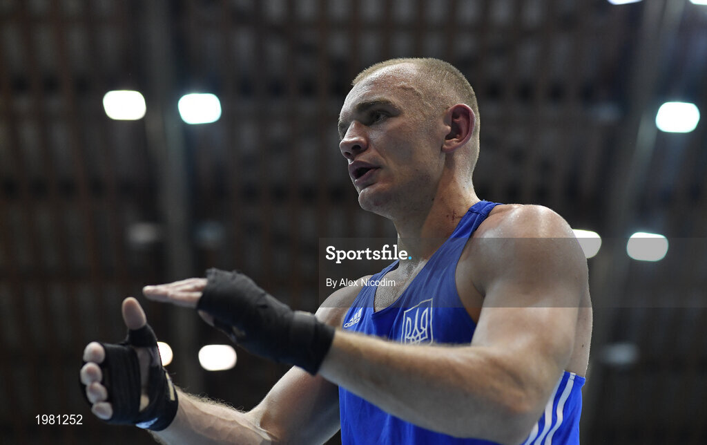 26 February 2021; Yevhenii Barabanov of Ukraine following his victory over Dmitri Galagot of Moldova after their men's welterweight 69kg semi-final bout at the AIBA Strandja Memorial Boxing Tournament in Sofia, Bulgaria. Photo by Alex Nicodim/Sportsfile