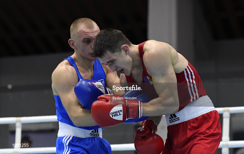 26 February 2021; Yevhenii Barabanov of Ukraine, left, and Dmitri Galagot of Moldova during their men's welterweight 69kg semi-final bout at the AIBA Strandja Memorial Boxing Tournament in Sofia, Bulgaria. Photo by Alex Nicodim/Sportsfile