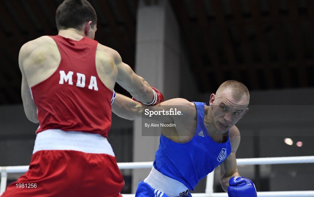 26 February 2021; Yevhenii Barabanov of Ukraine, right, and Dmitri Galagot of Moldova during their men's welterweight 69kg semi-final bout at the AIBA Strandja Memorial Boxing Tournament in Sofia, Bulgaria. Photo by Alex Nicodim/Sportsfile