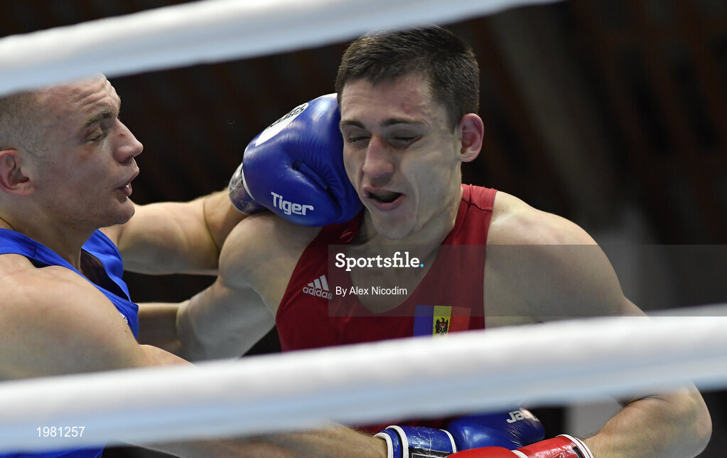 26 February 2021; Yevhenii Barabanov of Ukraine, left, and Dmitri Galagot of Moldova during their men's welterweight 69kg semi-final bout at the AIBA Strandja Memorial Boxing Tournament in Sofia, Bulgaria. Photo by Alex Nicodim/Sportsfile