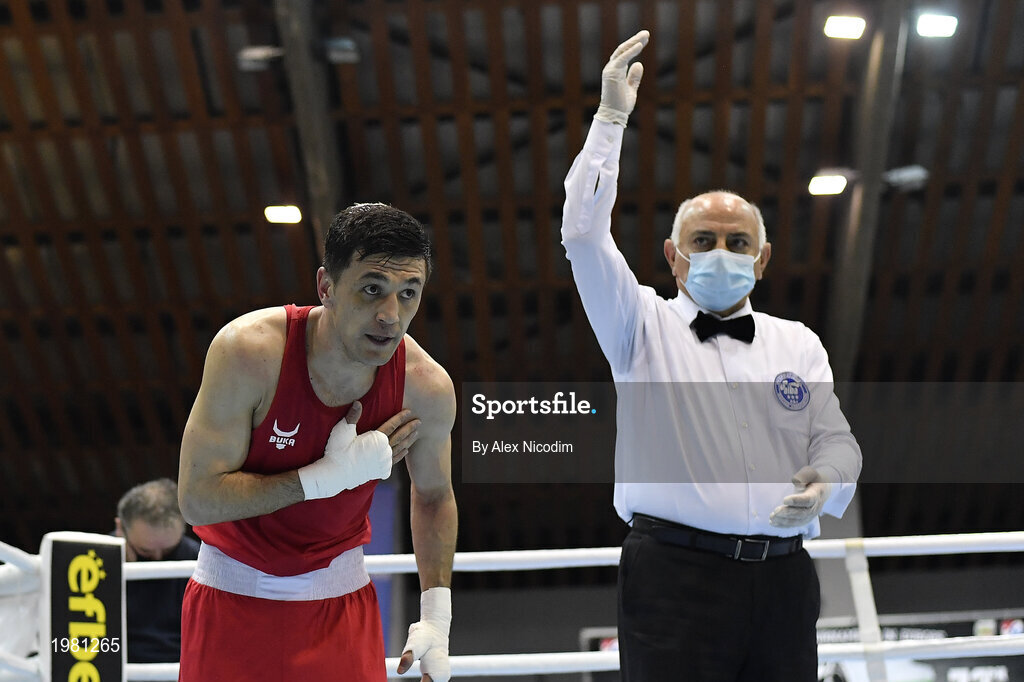 26 February 2021; Bobo-Usmon Baturov of Uzbekistan is declared victorious following the men's welterweight 69kg semi-final bout at the AIBA Strandja Memorial Boxing Tournament in Sofia, Bulgaria. Photo by Alex Nicodim/Sportsfile