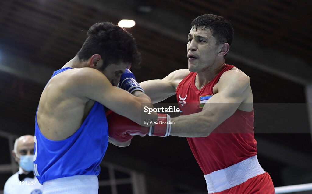 26 February 2021; Bobo-Usmon Baturov of Uzbekistan, right, and Boora Naveen of India during their men's welterweight 69kg semi-final bout at the AIBA Strandja Memorial Boxing Tournament in Sofia, Bulgaria. Photo by Alex Nicodim/Sportsfile