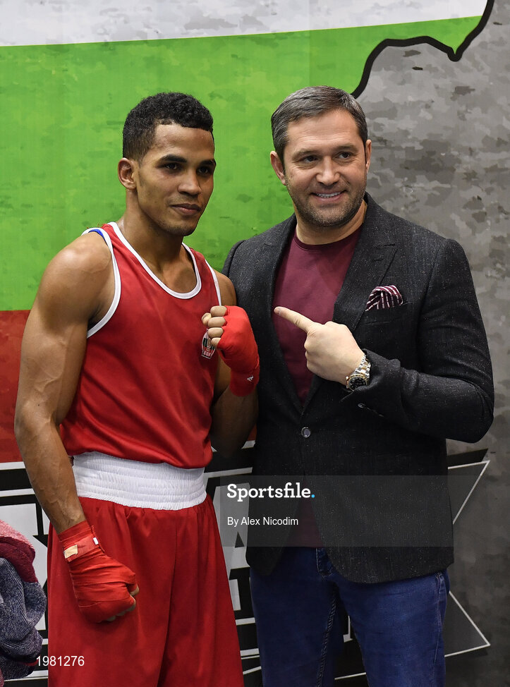 26 February 2021; Havier Ibanes of Bulgaria, left, with Krasimir Ininski, president of the Bulgarian Boxing Federation, following his victory in the men's Featherweight 57kg semi-final bout at the AIBA Strandja Memorial Boxing Tournament in Sofia, Bulgaria. Photo by Alex Nicodim/Sportsfile