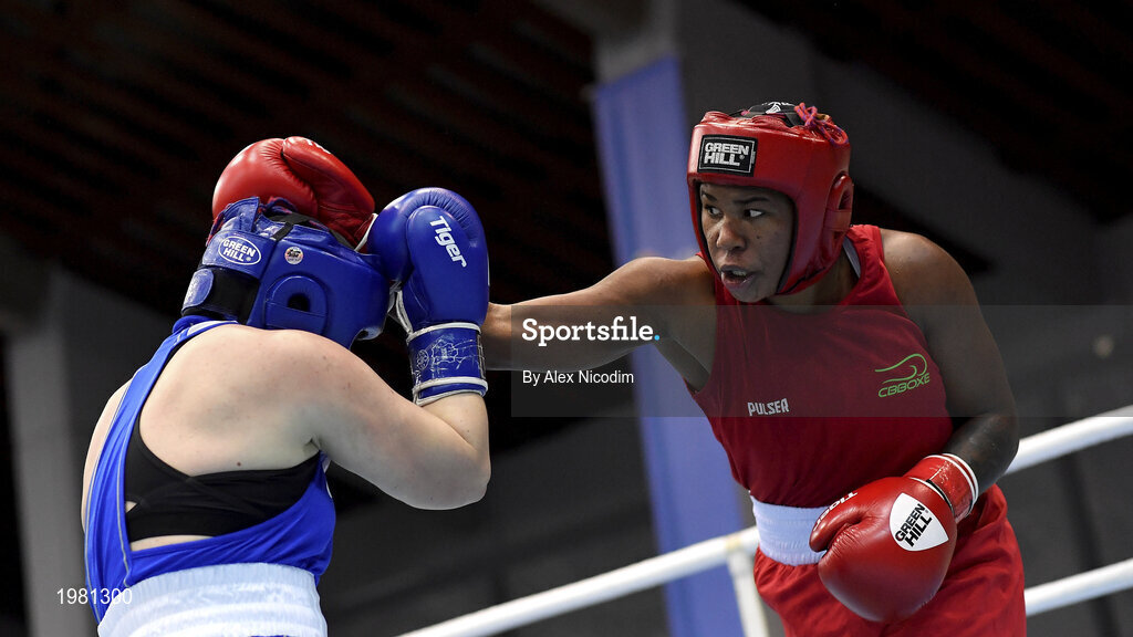 26 February 2021; Possantos Perejra of Brazil, right, and Nadezhda Ryabets of Kazakhstan during theie women's lightweight 60kg semi-final bout at the AIBA Strandja Memorial Boxing Tournament in Sofia, Bulgaria. Photo by Alex Nicodim/Sportsfile