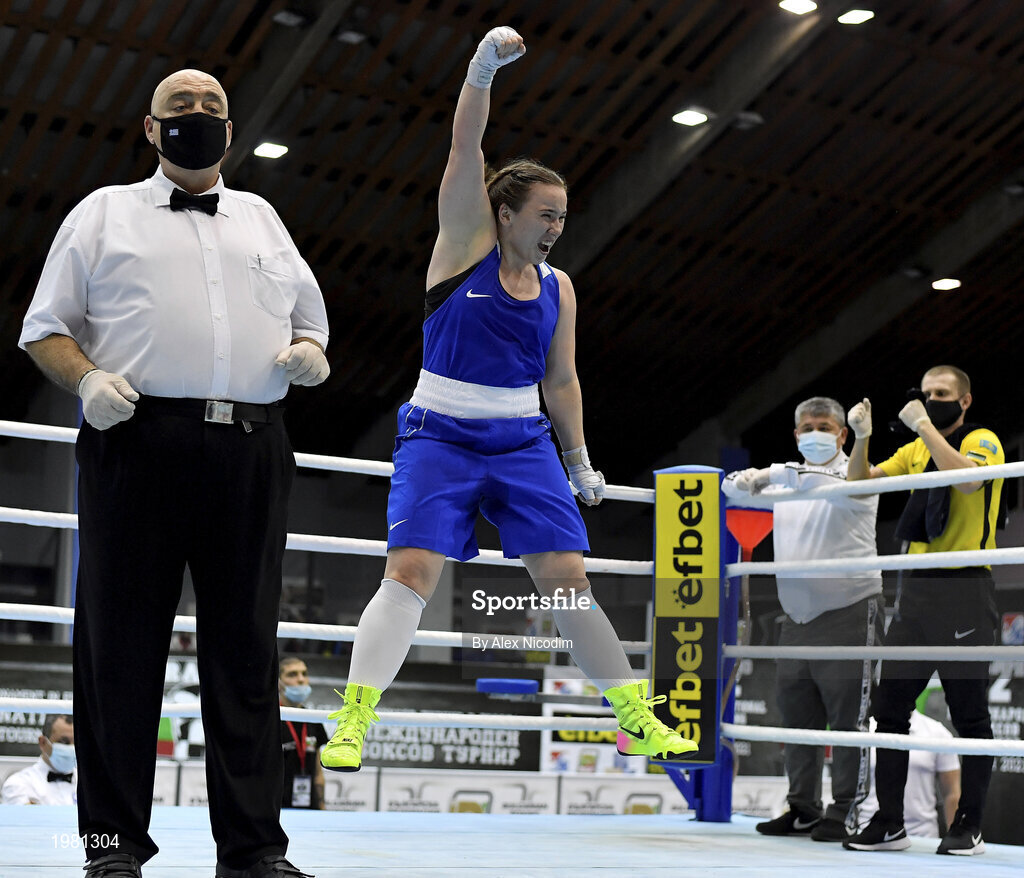 26 February 2021; Nadezhda Ryabets of Kazakhstan celebrates after being declared as victorious in the women's lightweight 60kg semi-final bout at the AIBA Strandja Memorial Boxing Tournament in Sofia, Bulgaria. Photo by Alex Nicodim/Sportsfile