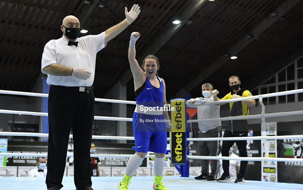 26 February 2021; Nadezhda Ryabets of Kazakhstan celebrates after being declared as victorious in the women's lightweight 60kg semi-final bout at the AIBA Strandja Memorial Boxing Tournament in Sofia, Bulgaria. Photo by Alex Nicodim/Sportsfile