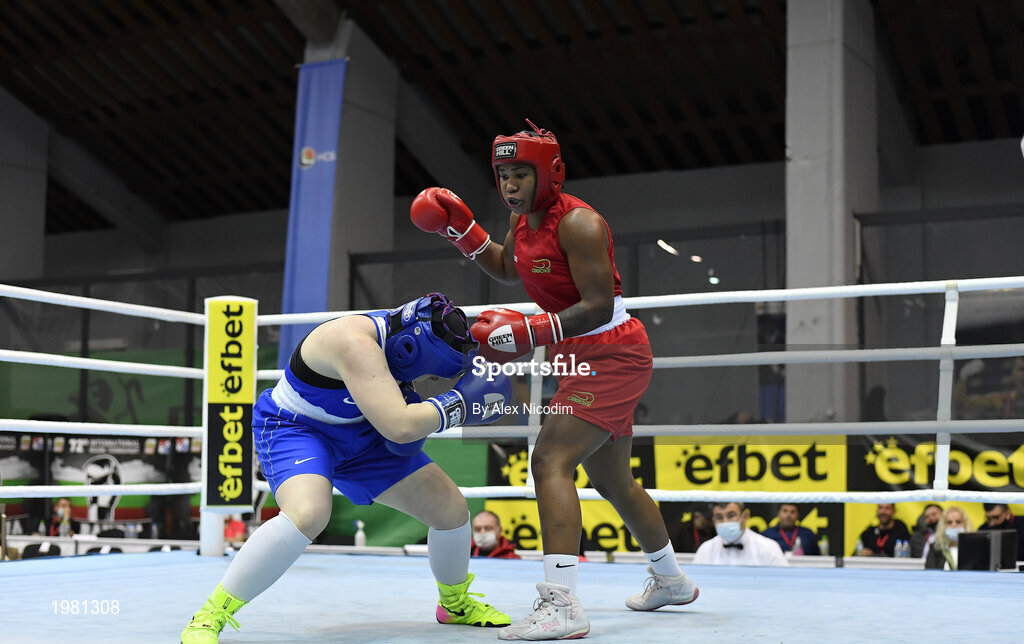 26 February 2021; Possantos Perejra of Brazil, right, and Nadezhda Ryabets of Kazakhstan during theie women's lightweight 60kg semi-final bout at the AIBA Strandja Memorial Boxing Tournament in Sofia, Bulgaria. Photo by Alex Nicodim/Sportsfile