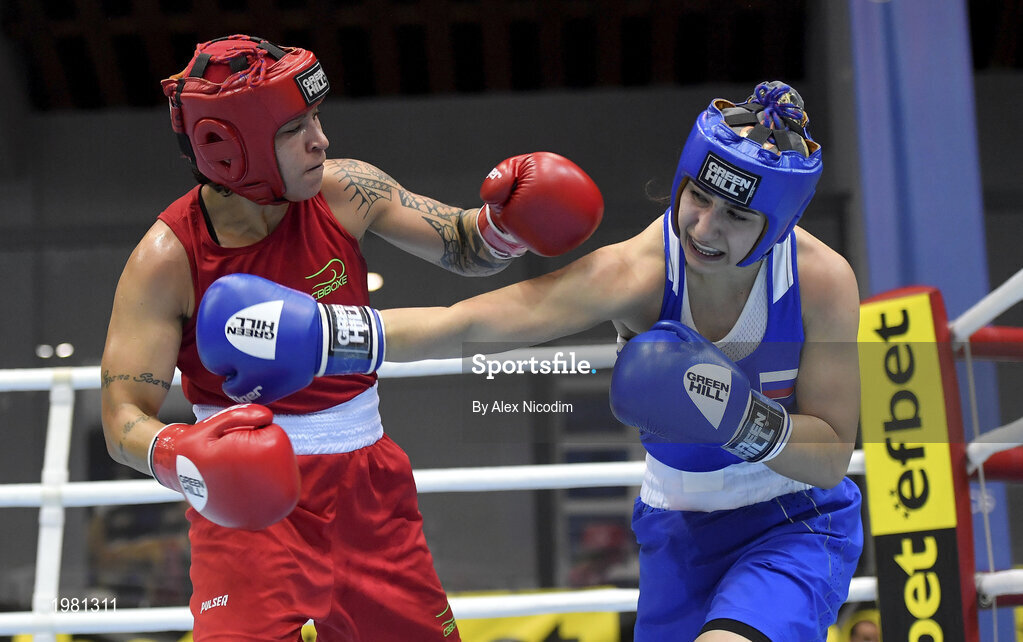 26 February 2021; Beatriz Ferreira of Brazil, left, and Nune Asatrian of Russia during their women's lightweight 60kg semi-final bout at the AIBA Strandja Memorial Boxing Tournament in Sofia, Bulgaria. Photo by Alex Nicodim/Sportsfile