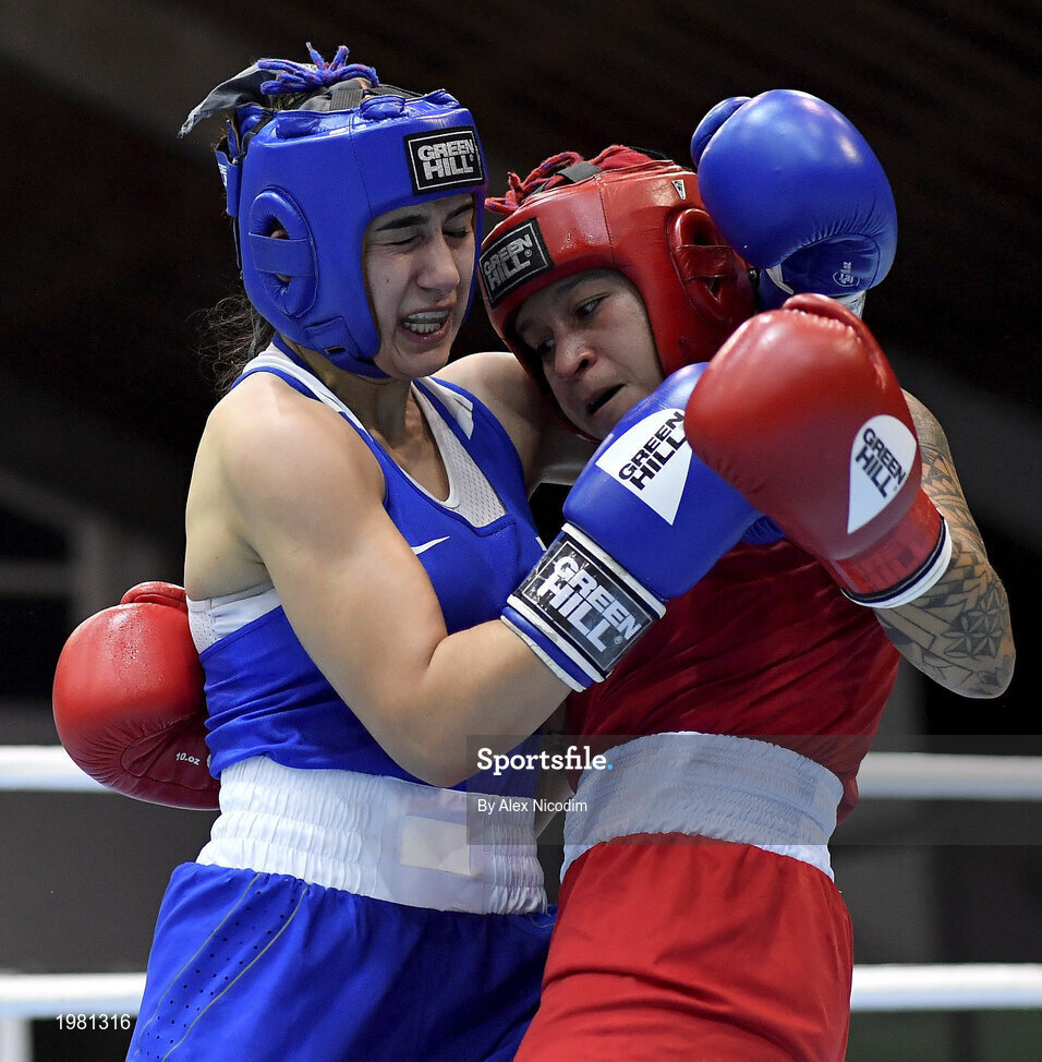 26 February 2021; Beatriz Ferreira of Brazil, right, and Nune Asatrian of Russia during their women's lightweight 60kg semi-final bout at the AIBA Strandja Memorial Boxing Tournament in Sofia, Bulgaria. Photo by Alex Nicodim/Sportsfile