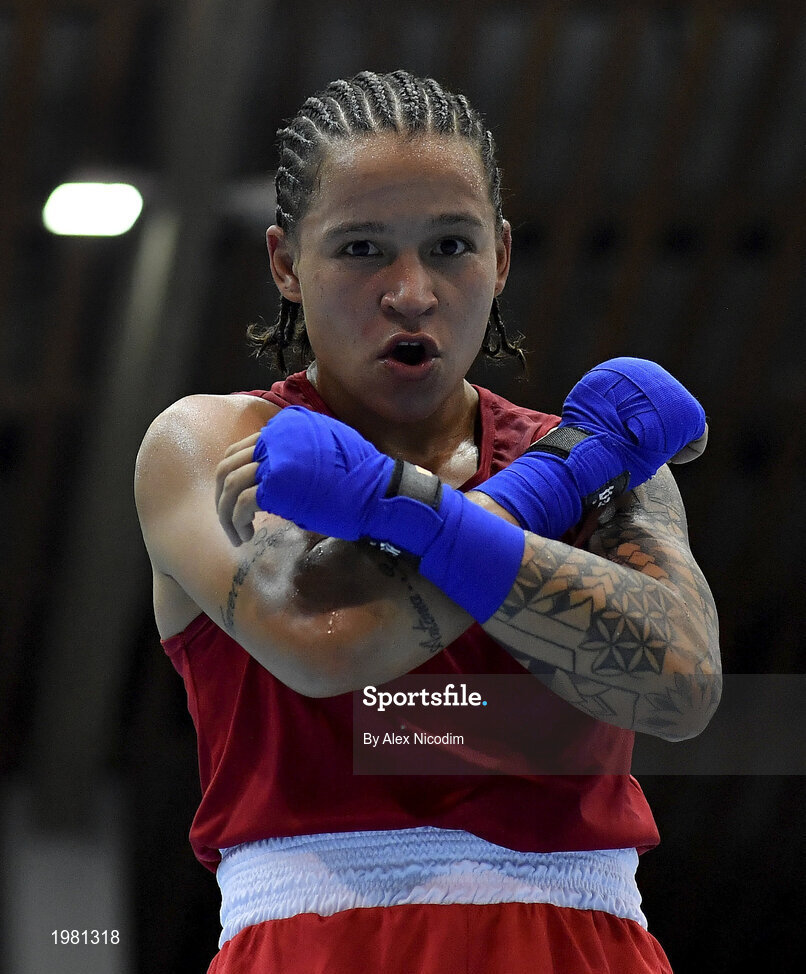 26 February 2021; Beatriz Ferreira of Brazil celebrates following her victory in the women's lightweight 60kg semi-final bout at the AIBA Strandja Memorial Boxing Tournament in Sofia, Bulgaria. Photo by Alex Nicodim/Sportsfile