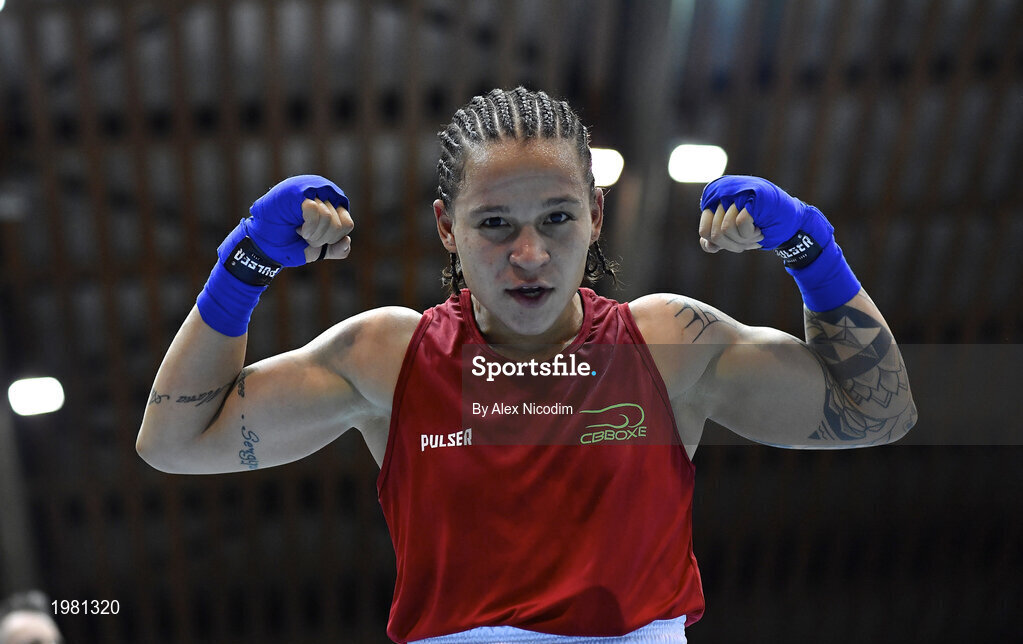 26 February 2021; Beatriz Ferreira of Brazil celebrates following her victory in the women's lightweight 60kg semi-final bout at the AIBA Strandja Memorial Boxing Tournament in Sofia, Bulgaria. Photo by Alex Nicodim/Sportsfile