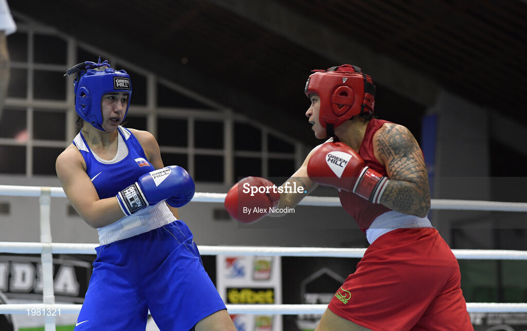 26 February 2021; Beatriz Ferreira of Brazil, right, and Nune Asatrian of Russia during their women's lightweight 60kg semi-final bout at the AIBA Strandja Memorial Boxing Tournament in Sofia, Bulgaria. Photo by Alex Nicodim/Sportsfile